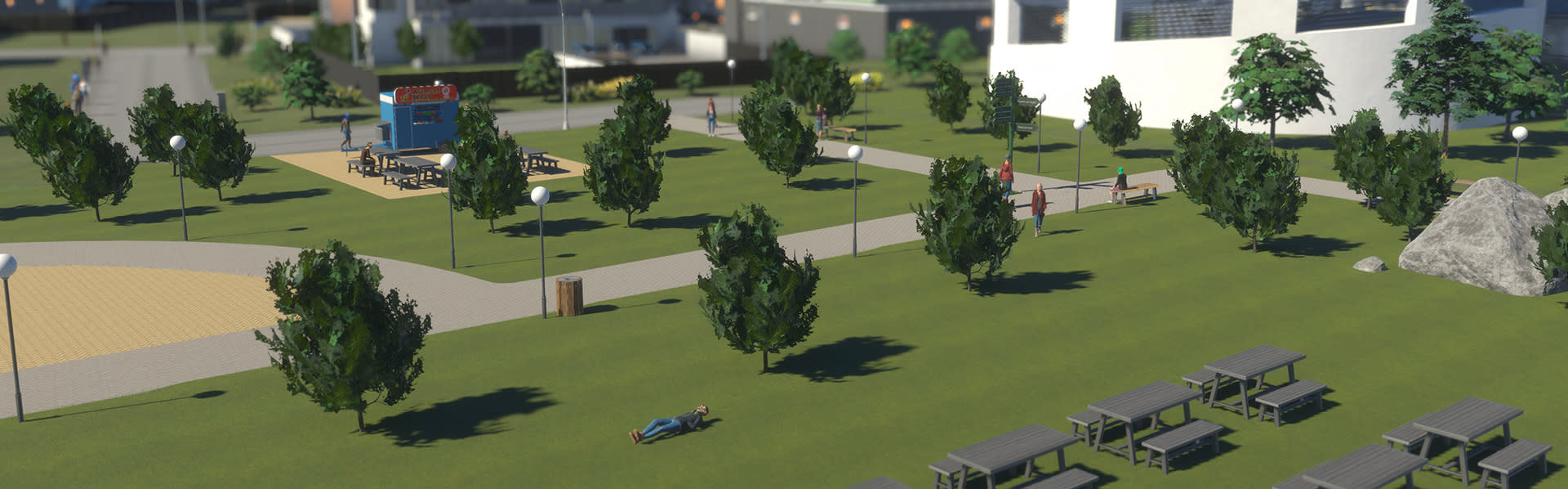 You can spot citizens and their four-legged friends around the city Each citizen has their own Lifepath which describes the major events in their lives. They either move into the city or are born there. They grow up, go to school, and find work. They spend their free time at home, in the parks and other attractions, or go shopping in the city’s commercial buildings. They might get sick or become unemployed, and, if they are happy, they will stay in the city and eventually grow old and die of old age. All of which you can keep an eye on.