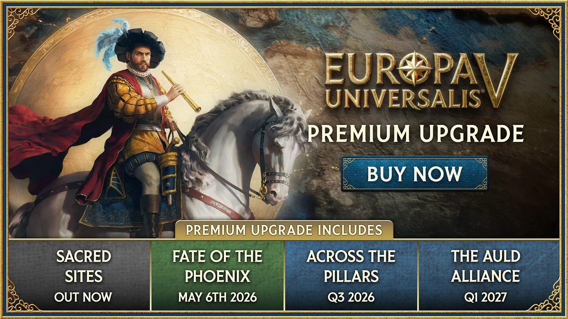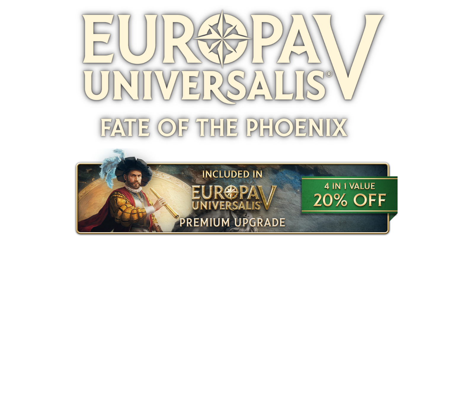 Dive deeper into the distant past with the Europa Universalis V Premium Upgrade which includes three DLC packs focused on the history of specific regions as well as an instantly unlocked cosmetic reward for all Premium Upgrade owners.