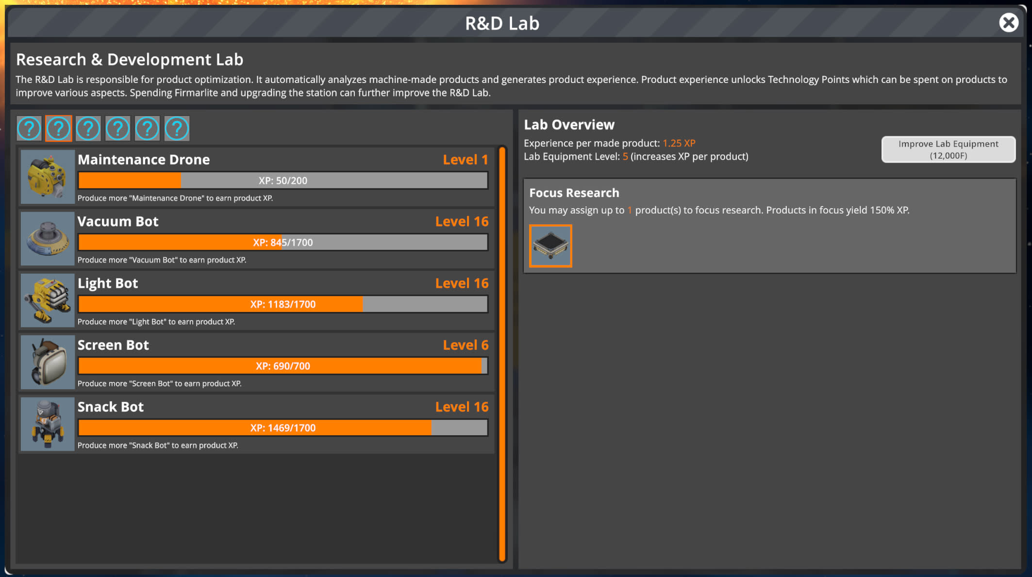 There are also some minor auxiliary features like focus research which allows you to focus on certain robots to increase their XP gain or to spend Firmarlite on increasing the base XP gain per produced robot.