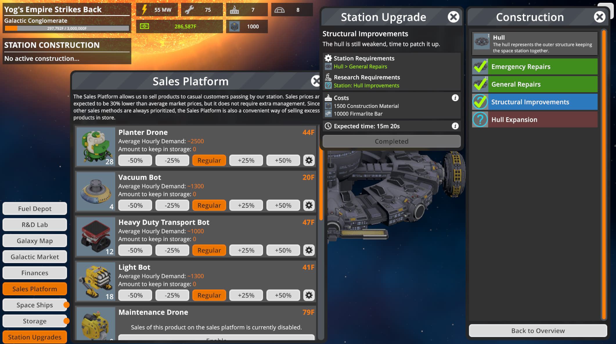 Let’s keep going with showing off more new and upcoming features. The research & development lab, in short R&D Lab, is a buildable upgrade for your space station which allows you to increase your robot production proficiency by analyzing the robots you produce. It allows you to gain experience points per robot type for each robot you produce. Each robot has a corresponding level and gaining one will reward you with a “Tech Point”.